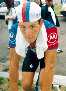 A very youthful Armstrong, warming up on rollers for the time trial stage of the 1992 Tour DuPont